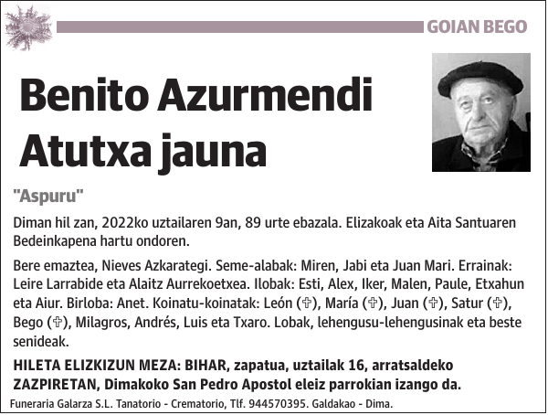 Tu busca de fallecimientos en Dima, Bizkaia ha concluido, por el hecho de que aquí las vas a poder localizar. Te ofrecemos todas y cada una de las necrológicas, toda la información sobre defunciones y fallecimientos de Dima, tanto de hoy, como de otros tiempos anteriores, de cualquier medio o bien empresa del sector funerario, a fin de que puedas localizar la esquela de ese conocido o bien familiar que nos dejó; de esta manera vas a poder asistir a su velorio, funeral o entierro, o podrás mandar un ramo de flores en señal de duelo por su muerte. Pequeños gestos que confortan a sus más allegados en tan duros momentos, pequeños detalles que se transforman en grandes en estas situaciones. Actos que se agredecen eternamente.
